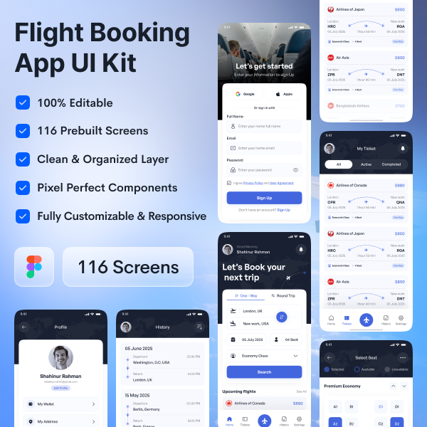 Flynur - Flight Booking Mobile App UI Kit Design