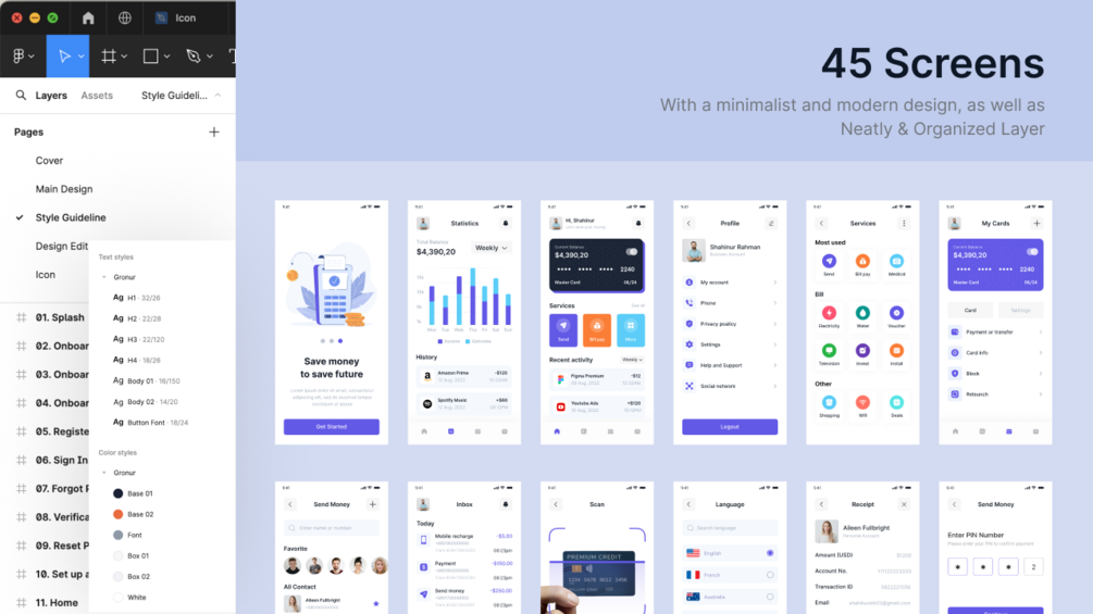 Bankoo is a Premium & High-Quality UI Kit with all the full features of the Payment service. Bankoo comes with a unique style and niche, you can easily edit and customize all elements with design components which can speed up the design process for your projects. Everything is integrated with the design system, so you only need to change the color, logo, text, and so on in the design system, then the entire design screen will automatically change.
